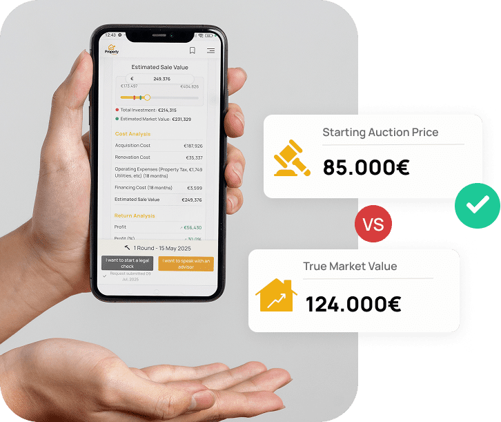 With property invest, you can accurately calculate the total acquisition cost, compare the auction price with the market value, and analyze the potential return on investment based on the selected strategy:
